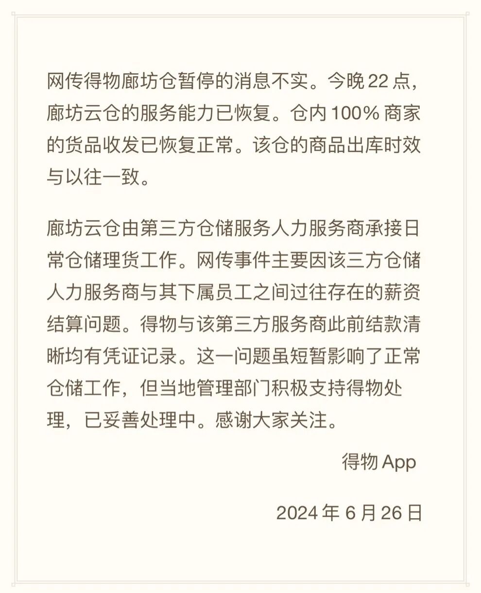 6月26日,多家媒体报道了得物廊坊仓库“停摆”事件,随后“东西被员工抢空”“临时工打架”的谣言四起。