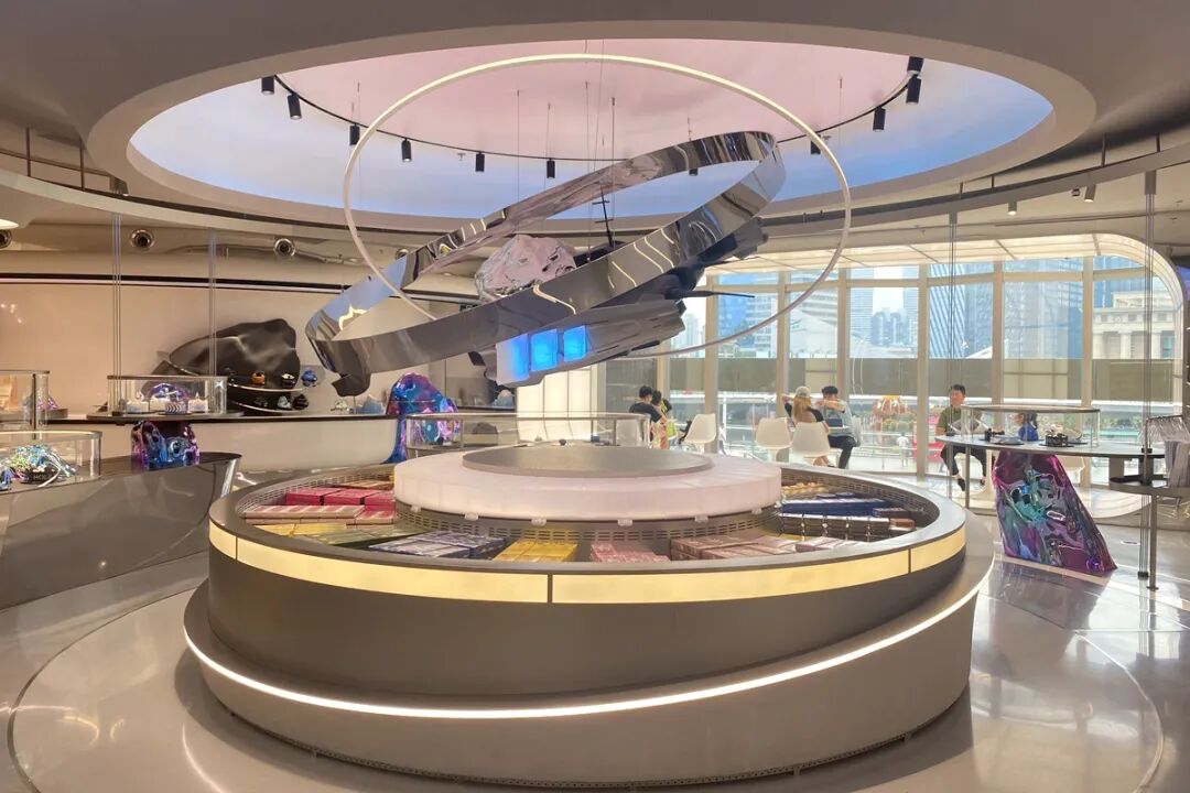 三楼天桥的入口处恰好坐落着好利来Holiland Travel主题店。乍看之下,人们很难将店铺和面包店画上等号。充满未来感的店铺设计内,射出霓虹灯色的鲜艳灯带贯穿其中,陨石坠落、地质重组,各种机舱造型的蛋糕摆放在内,吸引着到店顾客的目光。一般来说,佩奇总是熟练地直奔面包区,标配是半熟芝士和芋泥雪贝,偶尔也会来上一个枫糖唱片。