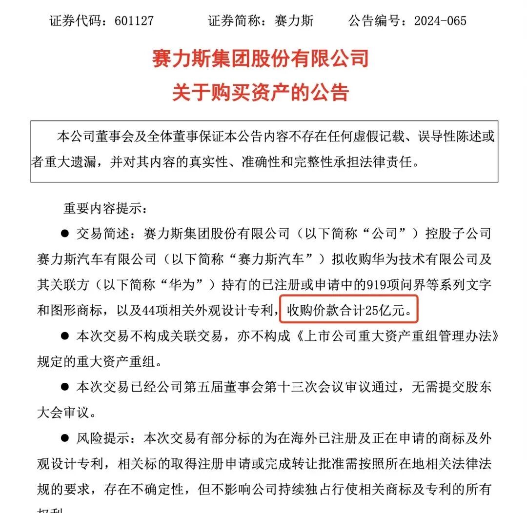 7月2日晚,赛力斯发布公告,公司控股子公司赛力斯汽车有限公司拟收购华为技术有限公司及其关联方持有的已注册或申请中的919项问界等系列文字和图形商标,以及44项相关外观设计专利,收购价款合计25亿元。