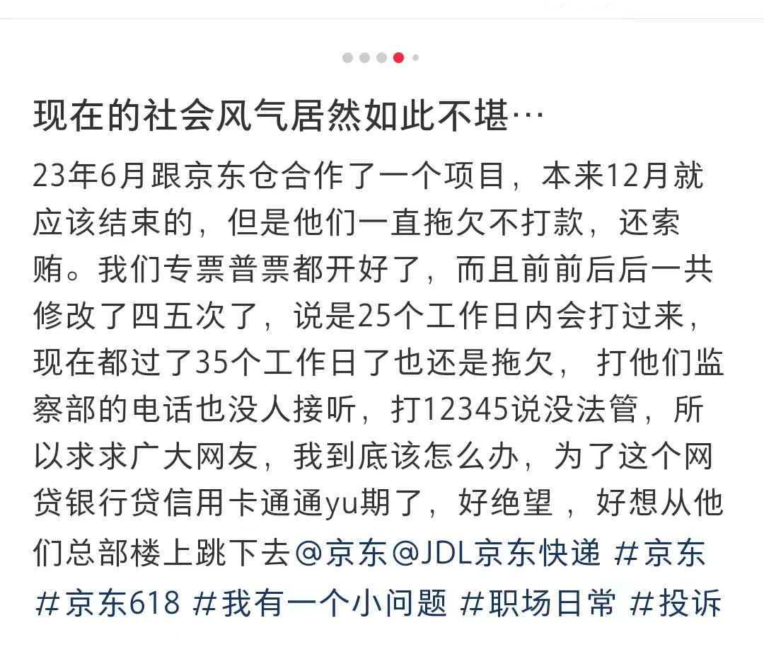 一位网友发文称,2023年6月与京东仓合作的一个项目,本来12月就应该结束,但是京东一直拖欠不打款,还索贿。