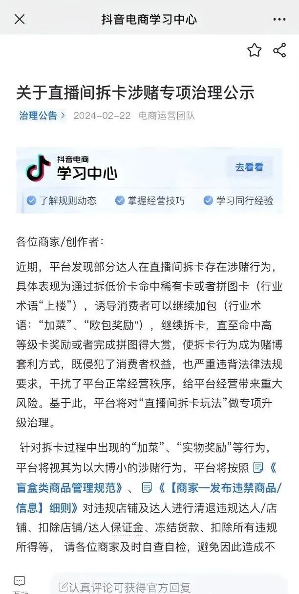 抖音官方《关于直播间拆卡涉赌专项治理公示》