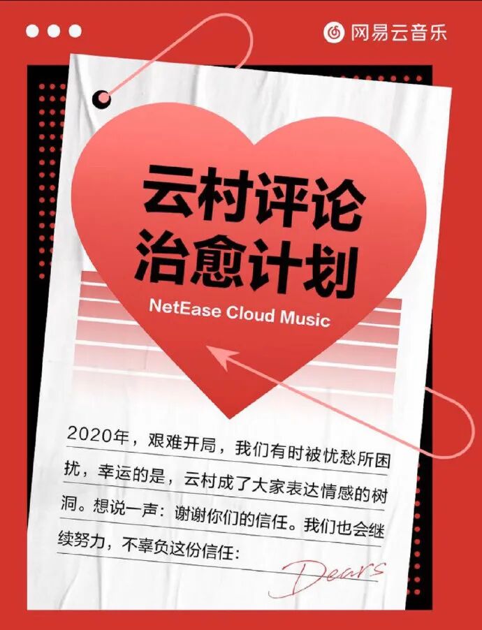 在“网抑云”出现后,网易云更是快速行动,推出云村评论治愈计划。包括邀请心理专家、心理专业志愿者加入“云村治愈所”,由万名“乐评达人”组成“云村乐评团”,发起乐评征集大赛。同时,升级《云村公约》治理虚假编造内容等。