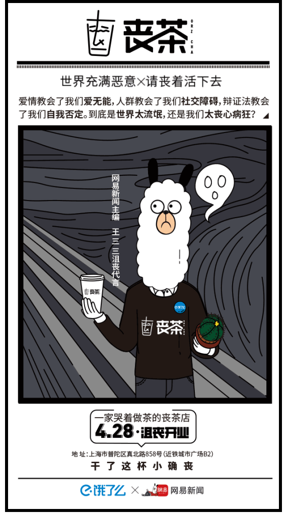 同年,网易新闻与饿了么合作,推出一间只营业4天的快闪店——“丧茶”。