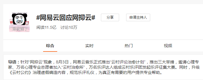 8月3日,网易云音乐发起“云村乐评治愈计划”危机公关计划,主张升级《云村公约》以打击清除虚假评论,规范乐评礼仪,以同在评论区的文艺、治愈语句来刹住逐渐失控的舆论。