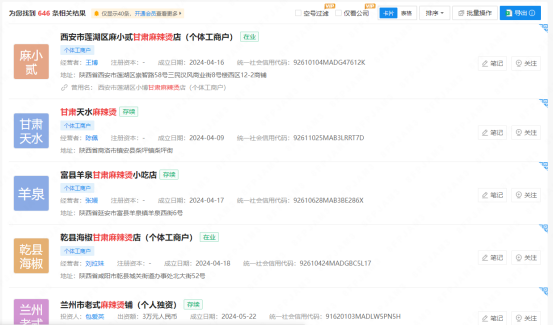 企查查显示,包括天津、西安、成都、重庆、哈尔滨、吕梁等城市集中出现了一批“甘肃麻辣烫”新店。且根据工商登记信息,近3个月内新增的麻辣烫店铺达到600+家,其中大多为今年新开业。