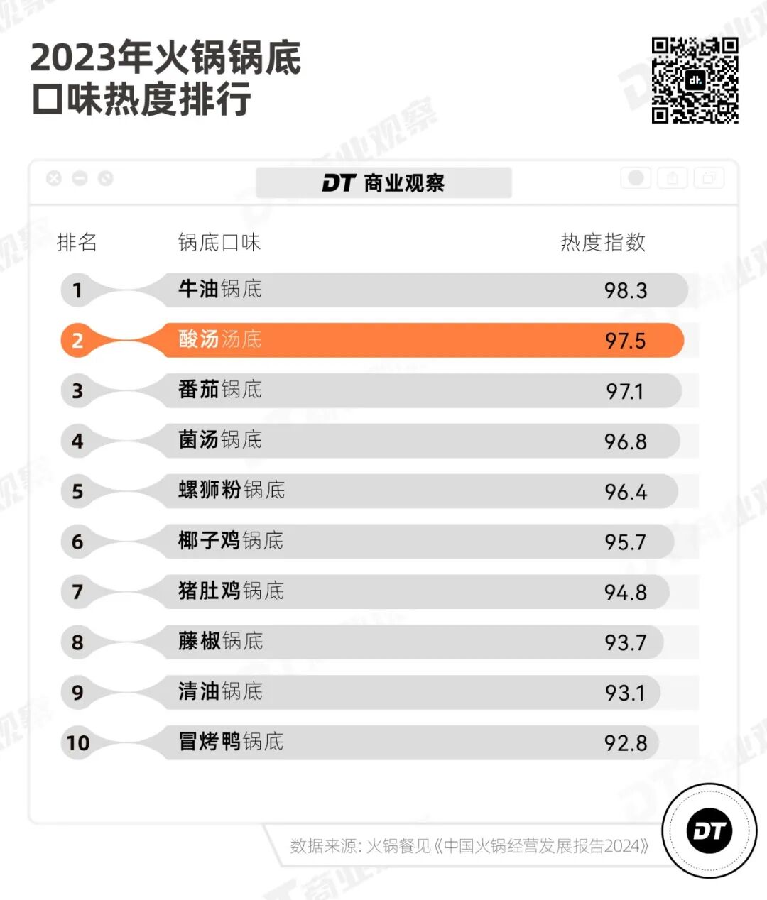 火锅餐见发布的《2024中国火锅经营发展报告》,在去年火锅锅底口味热度排行中,酸汤锅底排名第二,比火锅店常见的番茄锅底还要高,仅次于牛油锅底。