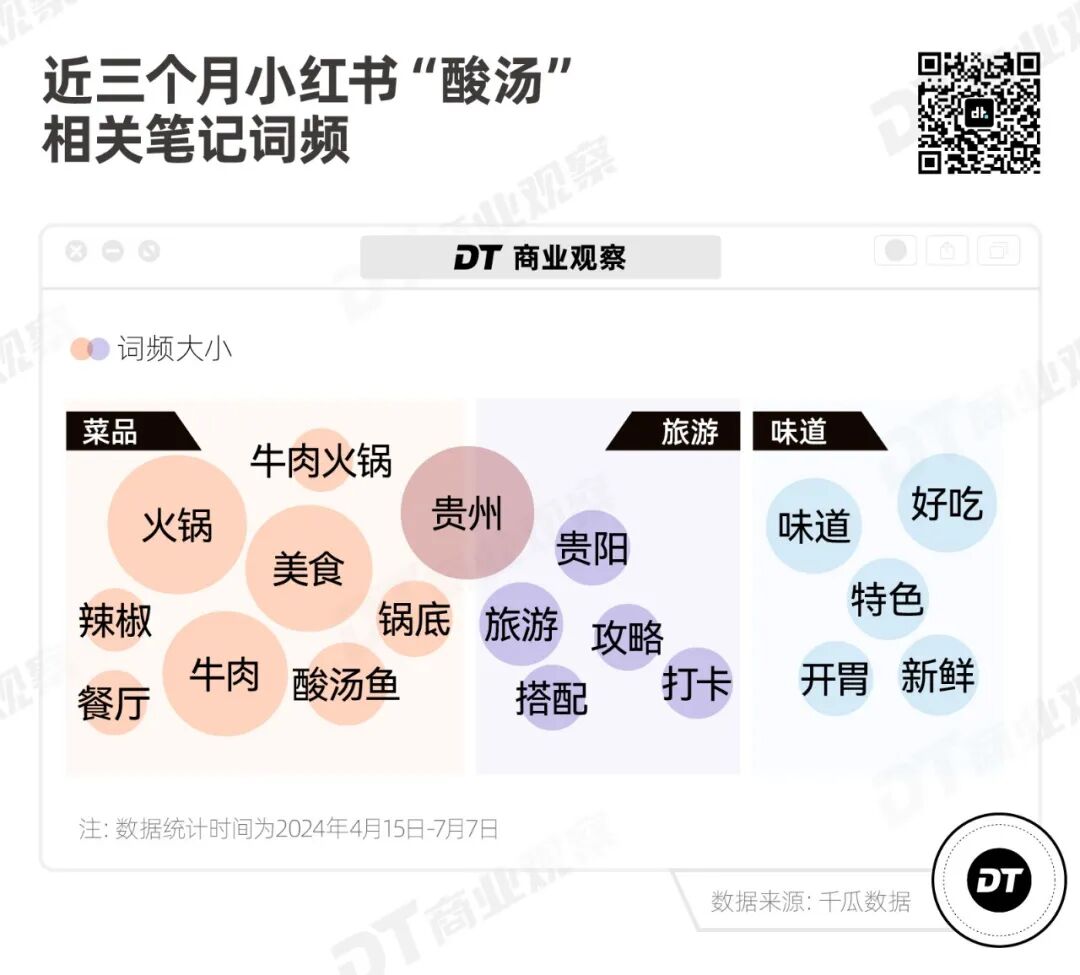 小红书相关笔记的高频词验证了这一点,酸汤菜品被讨论较多的是贵州酸汤火锅和酸汤鱼,其中“好吃”“特色”“新鲜”“开胃”频繁地被年轻人所提及。