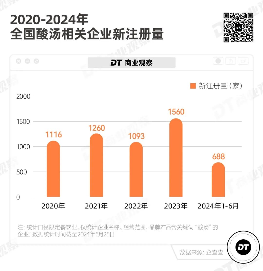 其实自2023年开始,餐饮市场上涌现了一批酸汤新品牌。根据企查查统计,2023年酸汤相关企业的新注册量达到了1560家,相比过去三年的新注册量都要多出超24%。