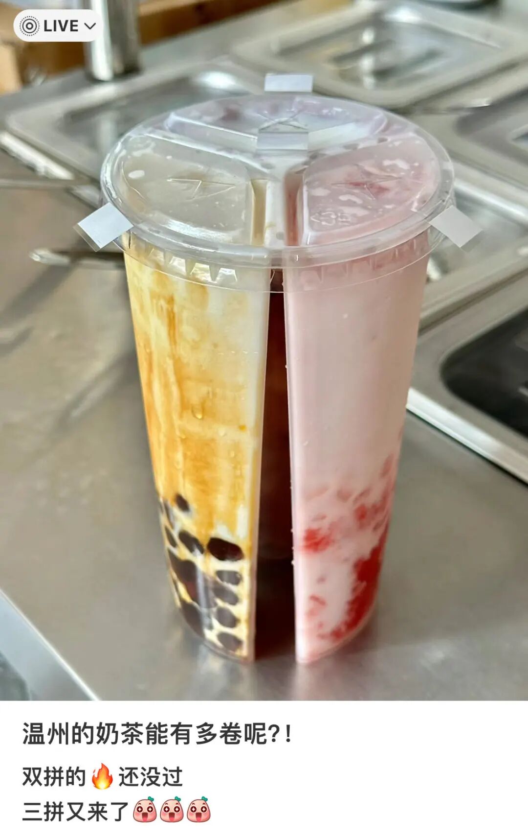 而最新流行的“双拼奶茶”,奶茶杯成了豪华的两居室。