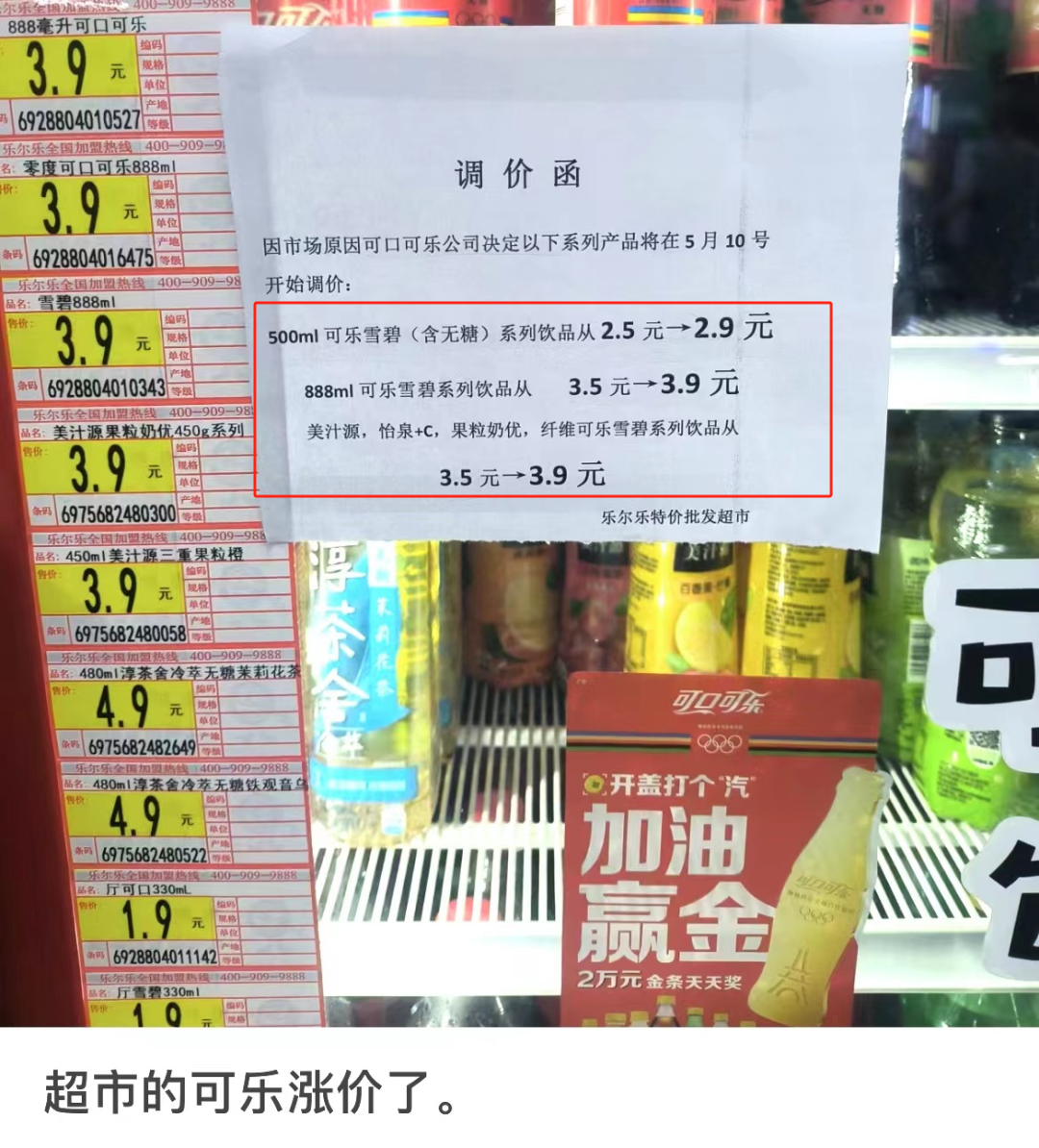 500ml的可乐,价格从3元涨到3.5元,680ml的可口可乐,已经涨到了5元。