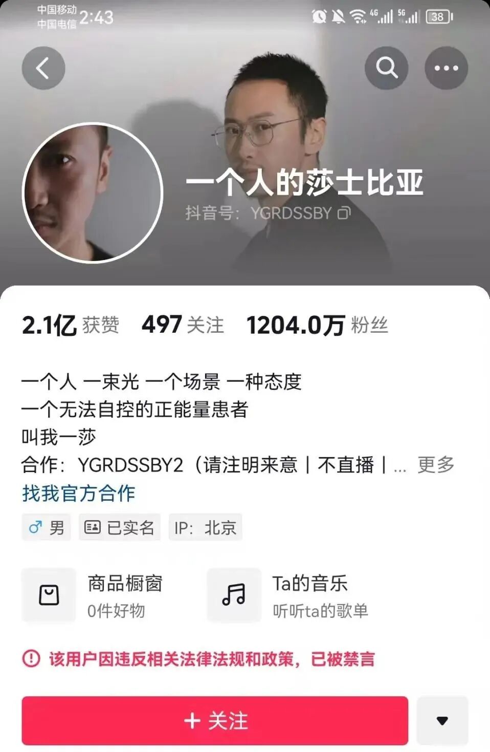 第二个被封杀的千万粉丝博主当数“一个人的莎士比亚”(以下简称“一莎”),在被快手、抖音封禁与禁言之前,其全网粉丝数超过1500万。