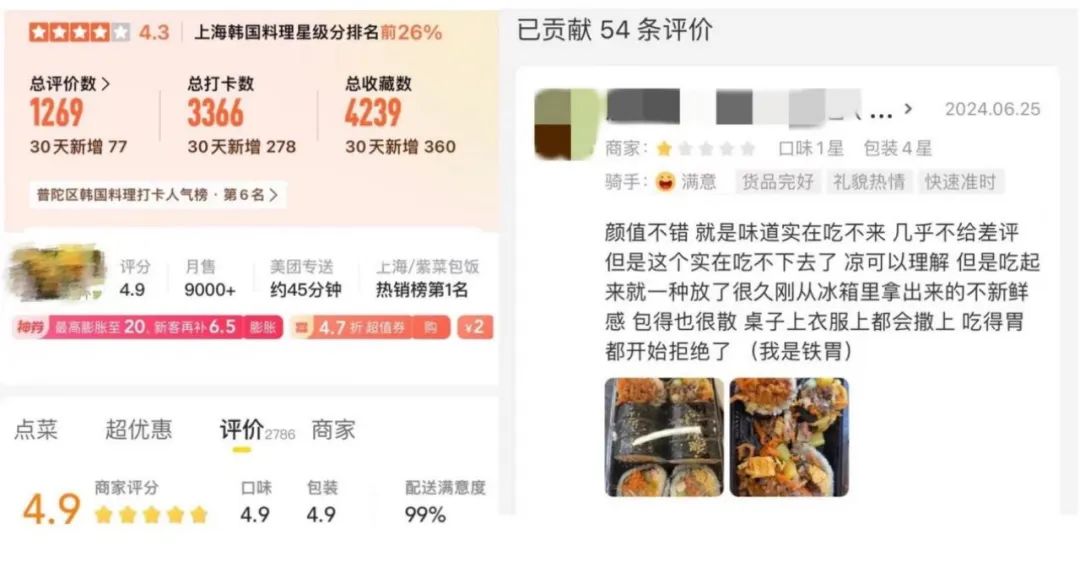 “如果说这家港式餐厅只是价格高、不符合个人口味,那我遇到的另一家好评榜的餐厅才是真的让我印象深刻。”小白对惊蛰研究所讲述了她另一次的踩雷教训。“当时恰好想吃紫菜包饭,于是在美团的热销榜上看到了这家排名第一的店,不过我还是谨慎地去看了一眼大众点评和小红书,觉得评论区的返图看起来都很有食欲,想着紫菜包饭能难吃到什么程度,就火速下单了。”