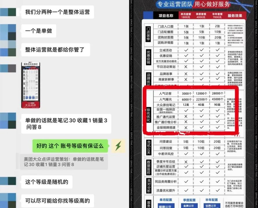 为了深入了解代刷好评的业务,惊蛰研究所以“想要提升餐厅流量”为由,在淘宝联系了一家“美团大众点评运营策划”,对方表示需要先发送店铺的选址定位,会帮忙免费做一个店铺诊断分析,然后根据店铺情况来给到运营计划方案。对方还主动提出:“餐饮店的话建议购买笔记收藏这类套餐”。通过对方发来的价格表发现,此类运营机构的报价并不低,半年套餐高达7000元。