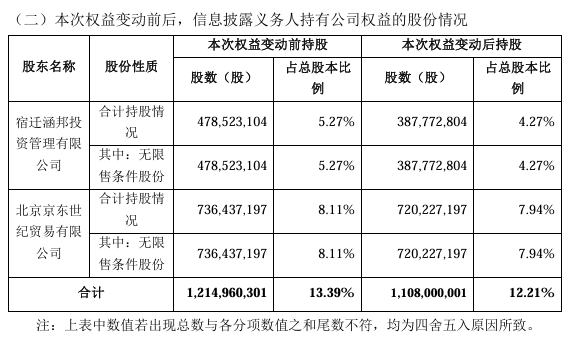 根据公告,减持计划实施过程中,宿迁涵邦通过集中竞价方式减持了9075.03万股,占公司当前总股本的1.00%;京东世贸通过大宗交易方式减持了1621万股,占公司当前总股本的0.18%。两者合共持股占总股本比例降至12.21%。