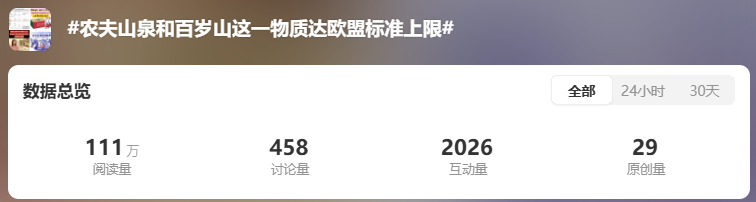 毕竟没有人比炮制热搜词的媒体更明白,#农夫山泉和百岁山这一物质达欧盟标准上限#这句话的传播度与争议比#农夫山泉和百岁山这一物质达欧盟标准#更符合互联网时代“新闻”的传播属性。