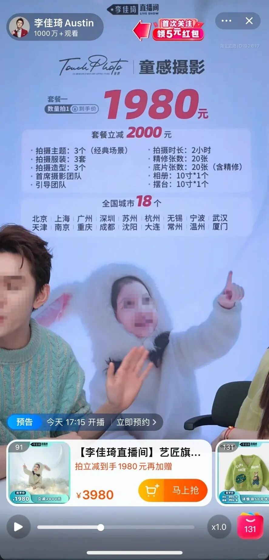 据《经视直播》记者采访,一位广东深圳的网友陈女士表示,自己于2022年“双十一”期间,出于对李佳琦主播的信任,在其直播间购买了韩国童感儿童摄影套餐。