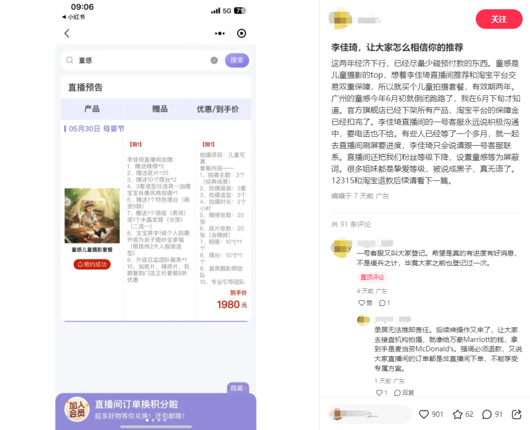 近日,有网友在小红书上发帖称,自己在李佳琦直播间购买了韩国童感儿童摄影套餐,近期想预约拍摄却发现该店闭店跑路,现在也无法退款。