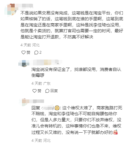 由于是在李佳琦直播间下单的,很多退款无门的消费者也曾去他的直播间留言,希望李佳琦对此事背负起相应的责任,以及处理一下退款事宜。