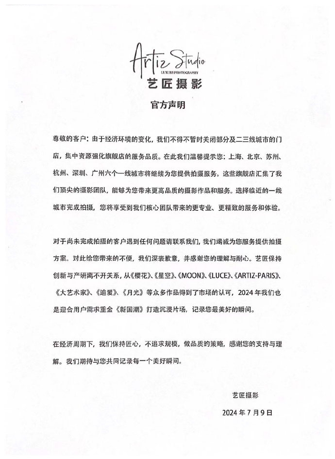 7月9日,韩国艺匠在官方微博发布声明称,由于经济环境的变化,不得不暂时关闭部分二三线城市的门店。目前只保留上海、北京、苏州、杭州、深圳、广州六个一线城市的拍摄服务。