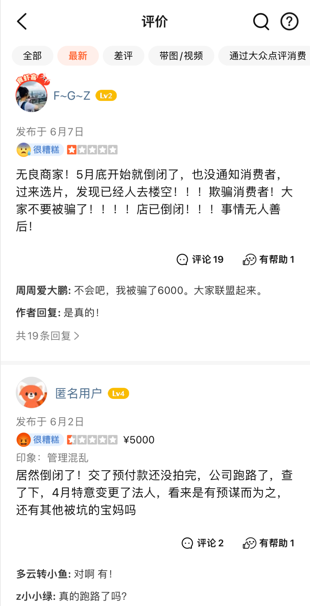 《互联网品牌官》在大众点评上搜索发现,唯一一家在深圳的韩国童感儿童摄影店显示歇业关闭,在其评论区的最新两条评论都在指责商家,称“5月底开始就倒闭了”,该条评论下方有不少“求拉维权群”的网友。