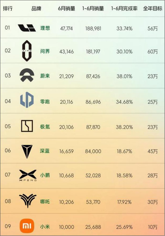 作为对比,排名第一的理想上半年交付量为188981辆,完成了56万-64万辆年目标的33.7%。6月售出了47774辆,较上月环比增长了36.4%。至于蔚来,虽然前几个月表现不如人意,但二季度情况明显好转,6月份交付了21209辆,再次突破了2万辆。