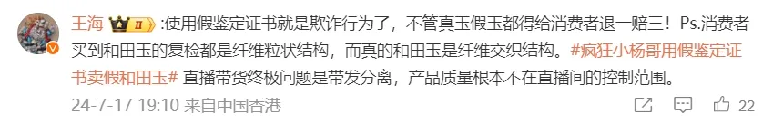 然而,职业打假人王海对此并不买账,专门跑到美腕声明下评论:“使用假鉴定证书就是欺诈行为,不管真玉假玉都得给消费者退一赔三!”