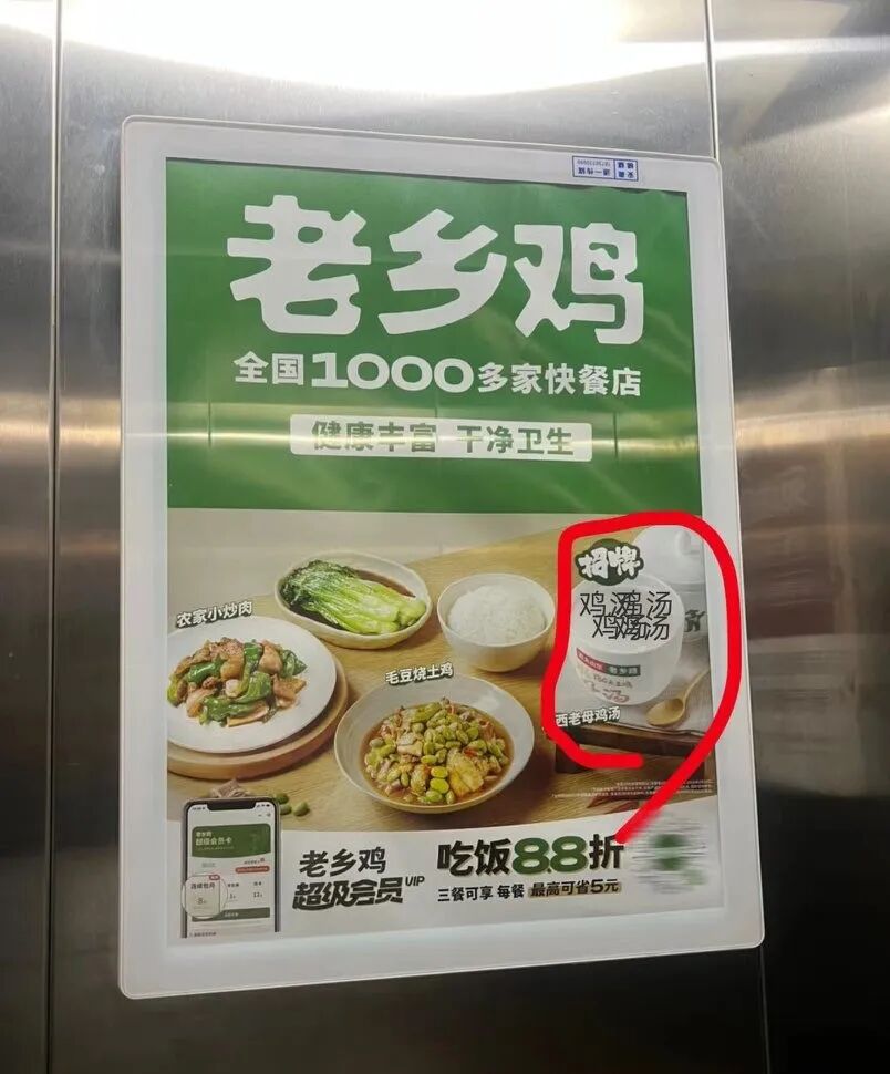 老乡鸡投电梯广告海报,鸡汤变成了空碗,严重怀疑是设计师鸡腿被扣太多“公报私仇”(不是)。