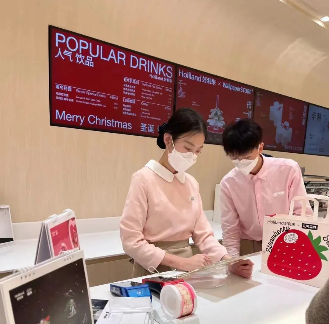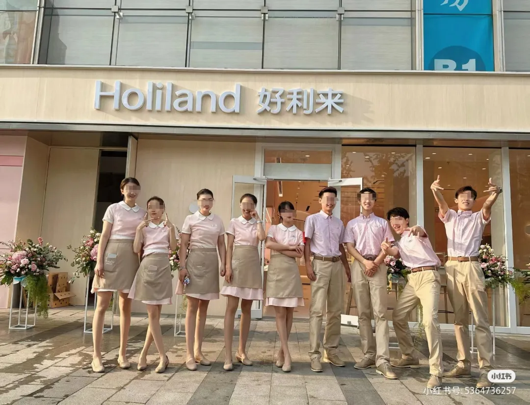 一张好利来的内部图曾在网上疯传:白色上衣黑色裤子,员工整齐划一地戴着口罩,撅着高高的PP。