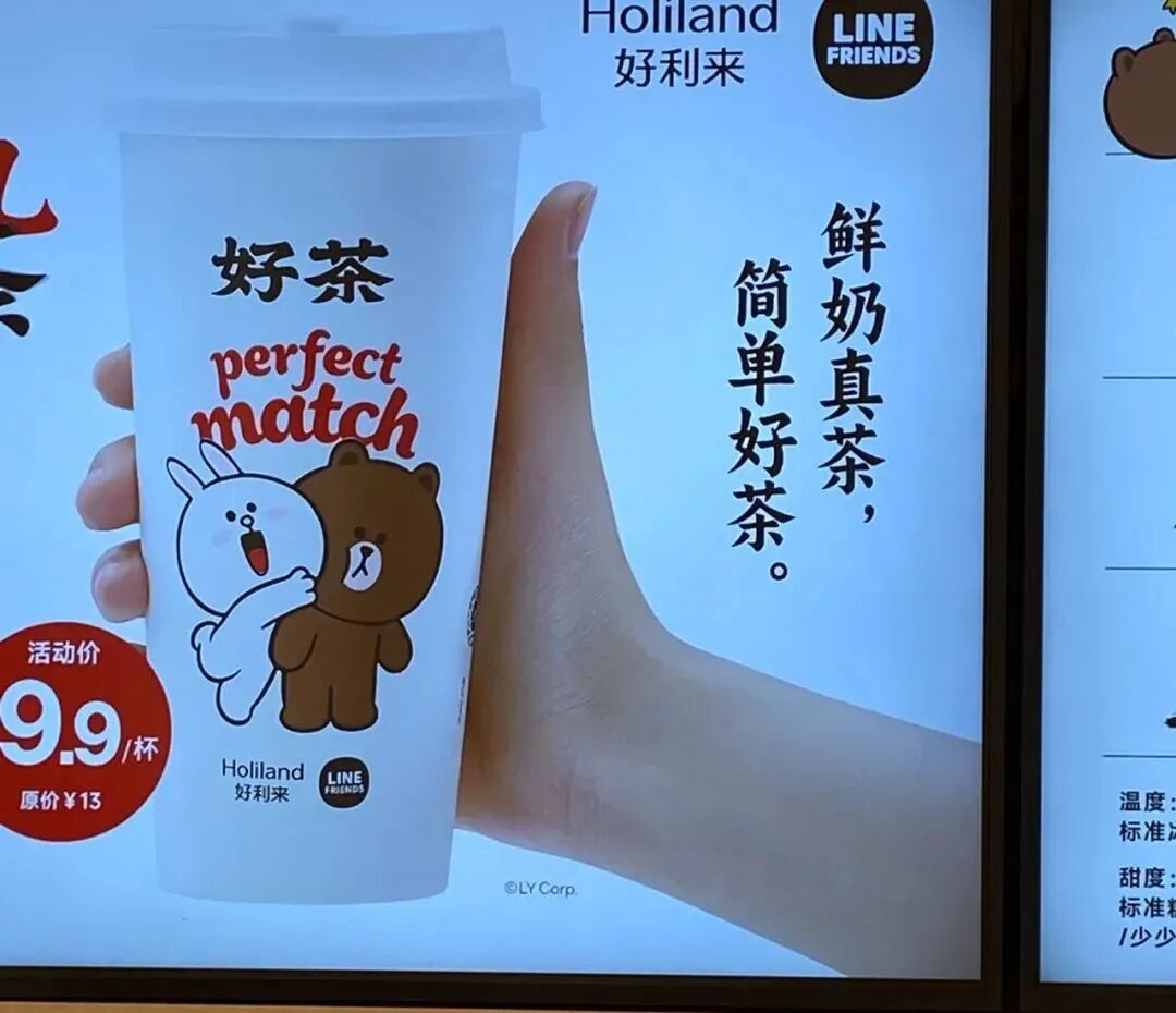 9.9元咖啡打得火热,好利来也不甘示弱,联名“LINE FRIENDS” IP推出了“9.9元奶茶月”,试图用低价当“敲门砖”,敲开奶茶市场大门。