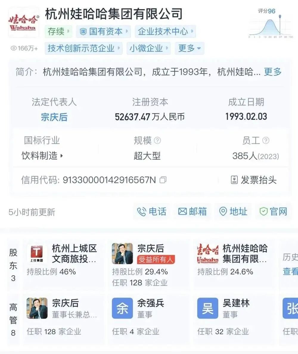 天眼查显示,杭州上城区文商旅投资控股集团有限公司是娃哈哈集团的第一大股东,持有娃哈哈集团46%的股份。更为重要的是其背后是杭州上城区国资委。而宗庆后持股仅有持娃哈哈集团的29.4%股份,剩余24.6%股份则由娃哈哈职工持股平台持有。