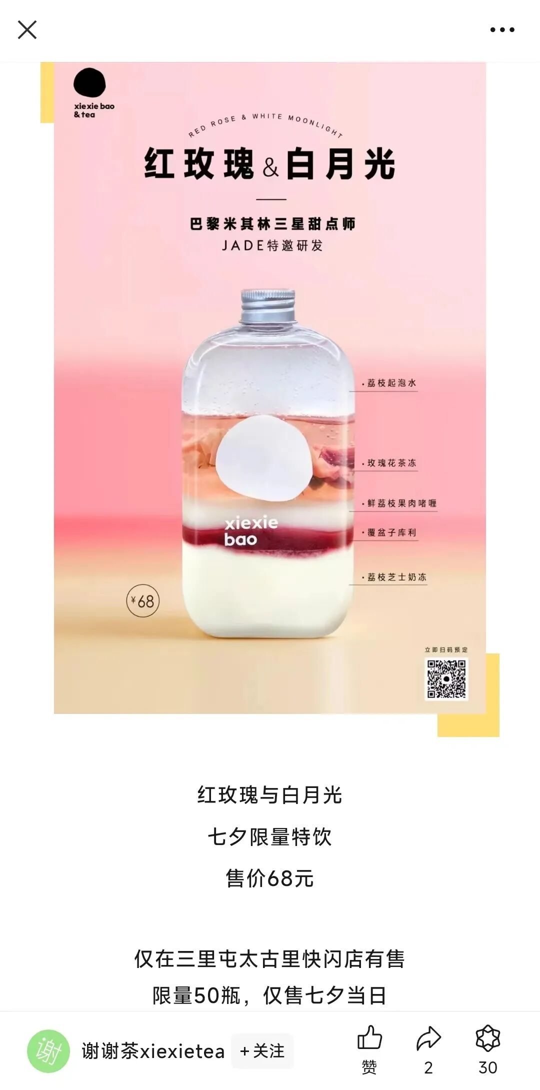 谢谢茶曾推出限定款奶冻茶,定价68元,这款奶茶宣称“巴黎米其林三星甜点师特邀研发”。