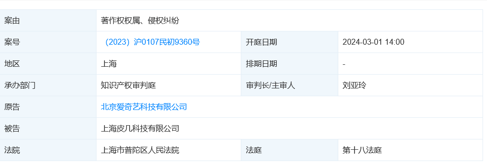 天眼查显示,今年3月,北京爱奇艺科技有限公司和谢谢茶唯一股东上海皮几科技有限公司相关著作权权属、侵权纠纷一案在上海市普陀区人民法院开庭。
