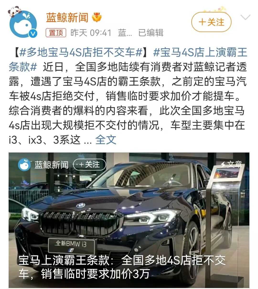 但是近日,全国多地陆续有消费者反映遭遇宝马的“霸王条款”,之前定的宝马汽车被4S店拒绝交付,需临时加价才能提车。