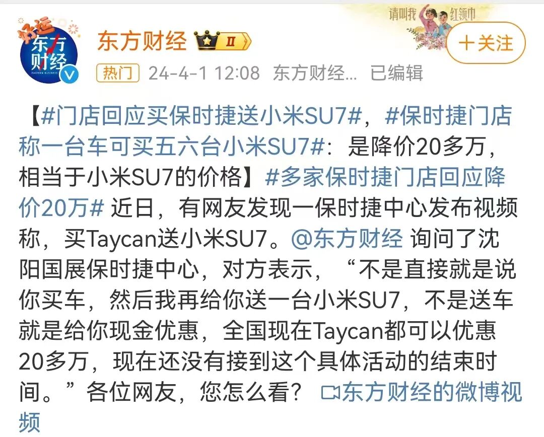 5月22日,华北地区某家门店率先打出“购买Taycan赠送小米SU7”的优惠旗号,后来该店表示促销活动并非直接赠送一台小米SU7,而最高可以打三十二万的折扣,差不多就是小米SU7 (29.99)的 Max版。