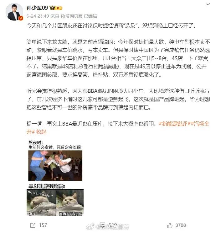 5月27日,保时捷中国发布了联合声明称,表示始终要积极倾听经销商来自一线的声音,厂商与经销商只有更加紧密地合作并彼此支持,才能更好因地制宜地满足中国消费者的需求,实现可持续的多赢发展。