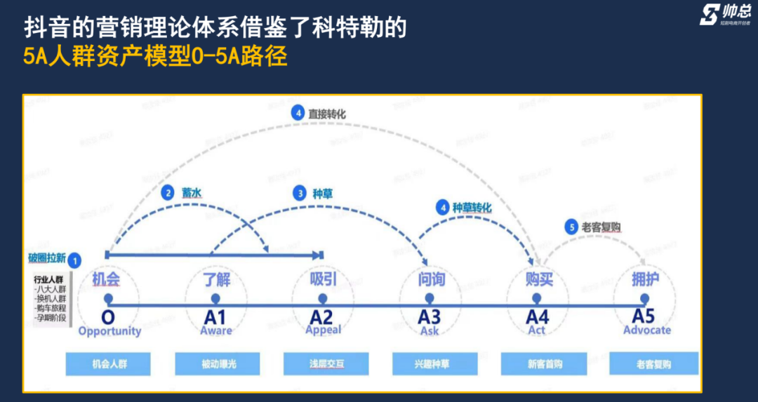 品牌定制剧的主阵地依旧是抖音。张帅解释,抖音有一个5A人群资产模型,O为机会人群或潜在消费者,5A是A1(了解)、A2(吸引)、A3(种草)、A4(购买)、A5(复购),而短剧就能够将品牌的A1、A2用户变成A3用户,用直播间承接看短剧的人。