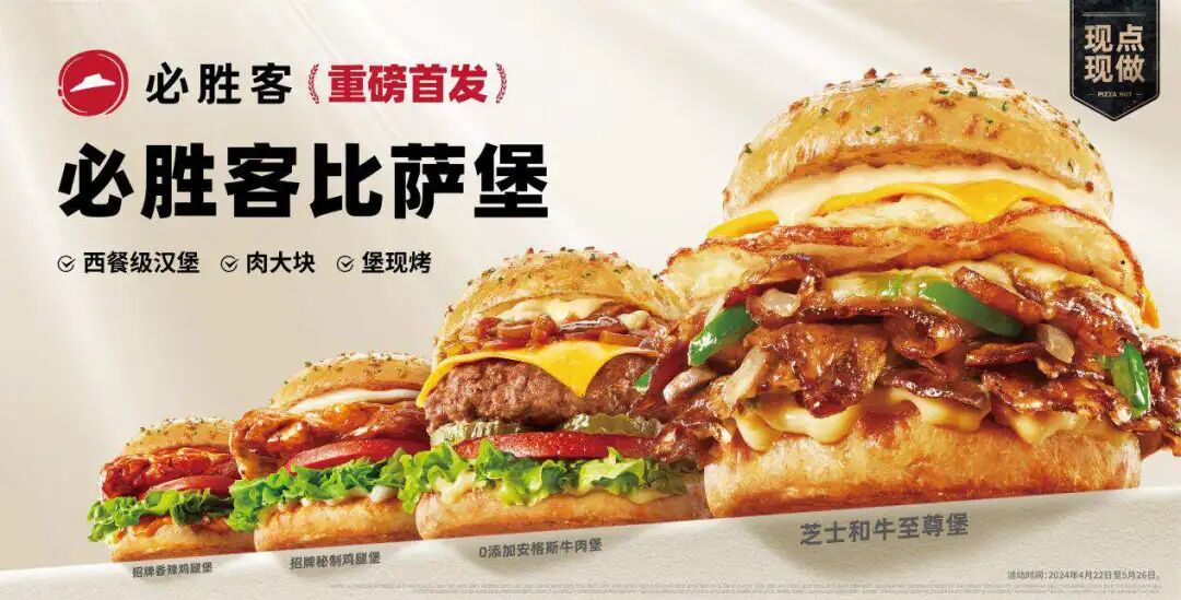 早在4月份,必胜客就在全国2000家门店上新了“比萨堡”,西餐级大块肉搭配必胜客独有的“比萨面包”,现点现烤,19.9元起,最顶级的芝士和牛至尊堡只要32元。