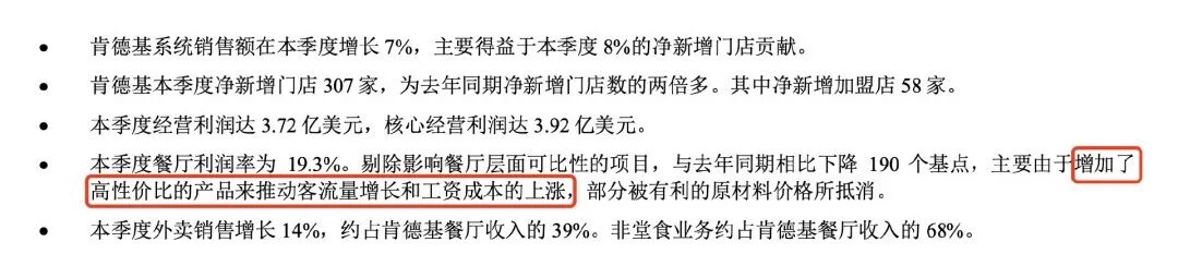 百胜中国2024 年第一季度财务业绩报告显示,肯德基的餐厅利润率为19.3%,同比下降1.9个百分点。报告还特别提到,下降的原因是增加了高性价比产品,例如肯德基版本的“穷鬼套餐”——OK三件套,黄金SPA鸡排堡+中薯条+可乐,只要19.9元。
