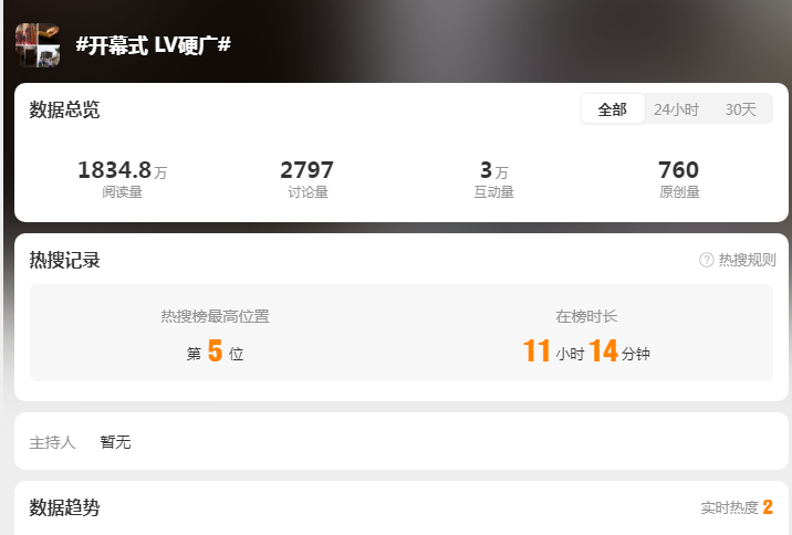 开幕式直播现场宛如LV的“大型硬广画面”,不知道的人还以为LV哪里请来的推广,同时“开幕式 LV硬广”词条一度登上微博热搜。