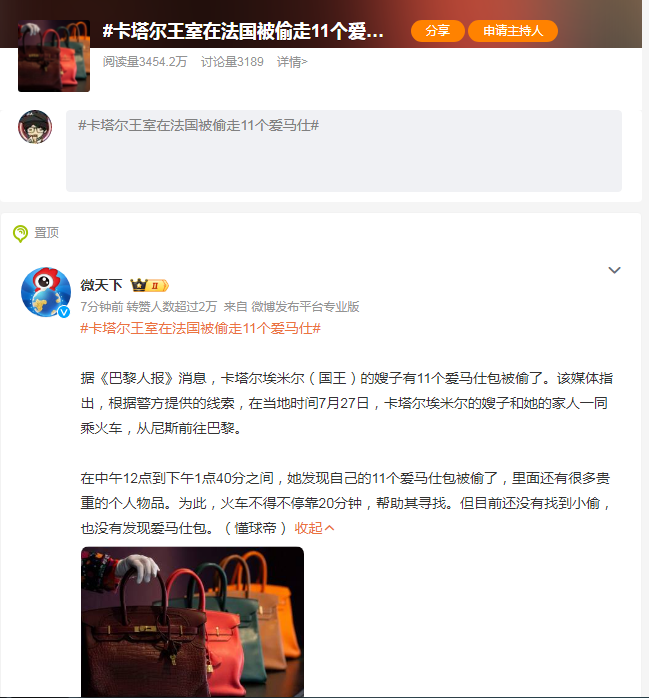 这不才刚开始,就有传出卡塔尔王室被偷了11个爱马仕包包。