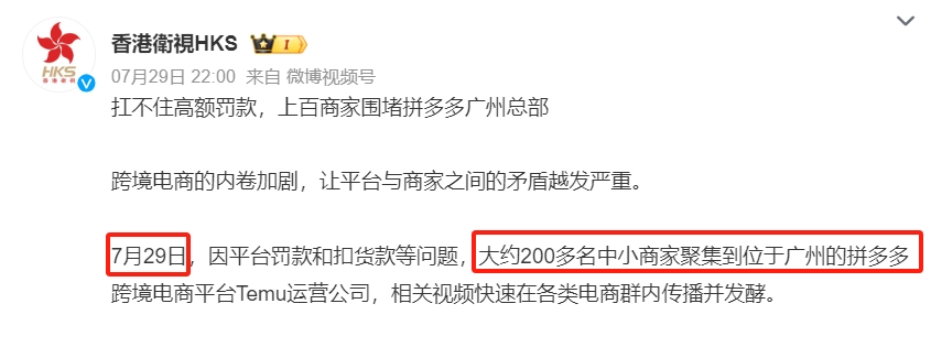 到了昨天(7月29日),香港卫视HKS微博信息称,又有200多名中小商家再度聚集在Temu广州总部。