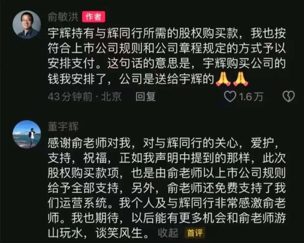 不过,购买股权的7658.55万元是由俞敏洪及东方甄选代为支付的。俞敏洪解释称,“宇辉持有与辉同行所需的股份购买款,我也按符合上市公司规则和公司章程规定的方式予以安排支付。”也就是说,与辉同行是俞敏洪送给董宇辉的。