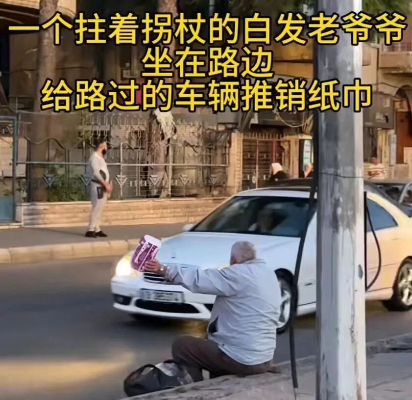 之前一位旅游博主在叙利亚大马士革街头,遇到了一位坐在马路边卖纸巾的老爷爷。