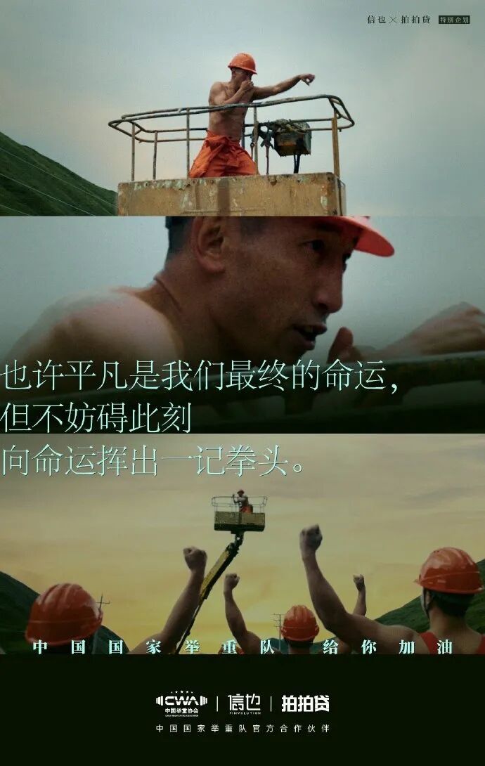 信也拍拍贷联合人民日报体育邀请中国国家举重队以举重之姿为大家加油。用“举铁”和“夺金”的概念,输出了这句对普通人也非常有鼓励意义的文案。