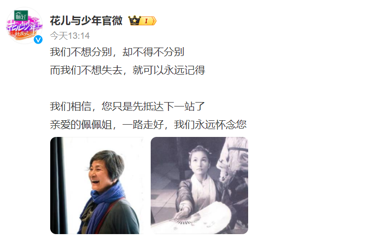7月份,武侠影后郑佩佩离开了。作为曾经与其合作过综艺《花少》,特地取了13:14这个时间点,输出了一段怀念文案。