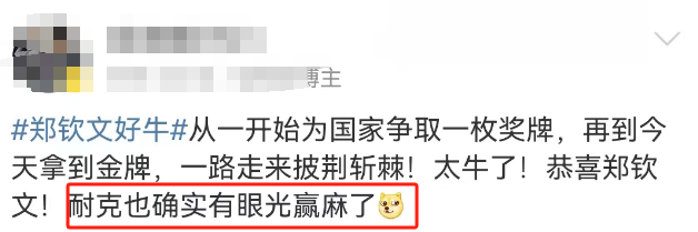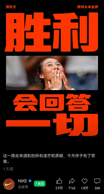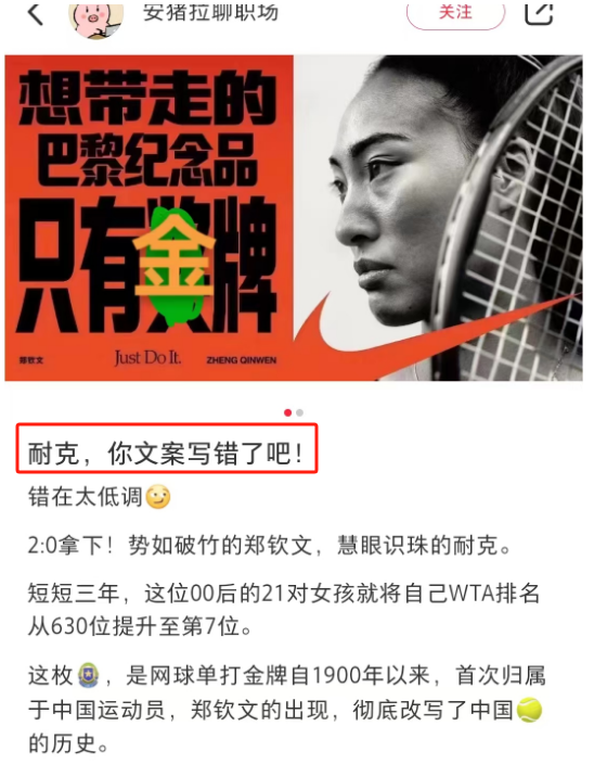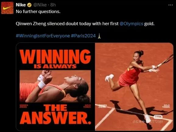 郑钦文夺冠后,耐克是这样宣传:郑钦文的金牌让质疑声音闭嘴了。