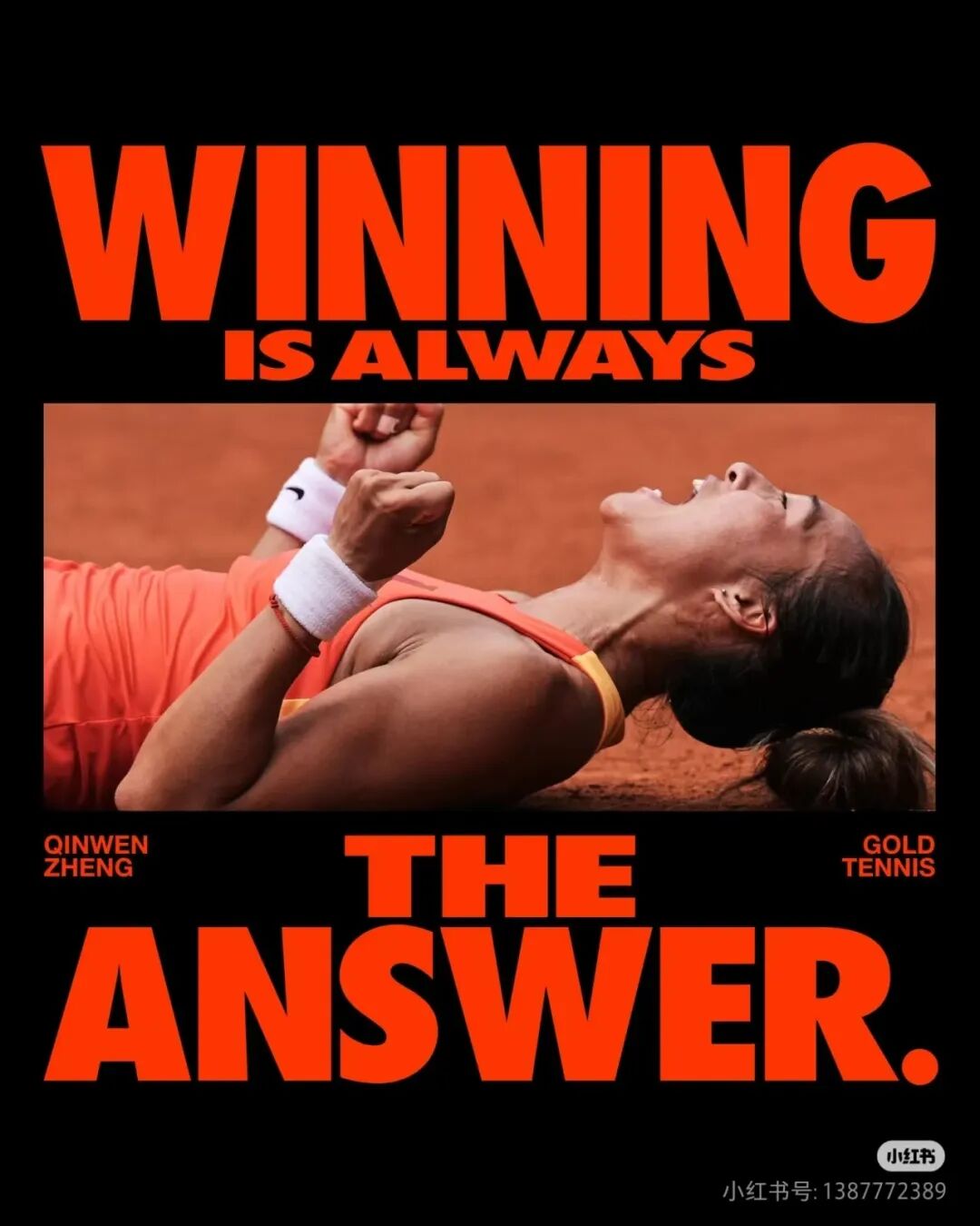 郑钦文夺冠后,耐克选择庆祝夺冠的海报,也颇有技巧。