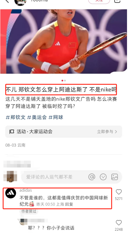 果然郑钦文不是一个人在战斗,还有阿迪耐克在打商战。