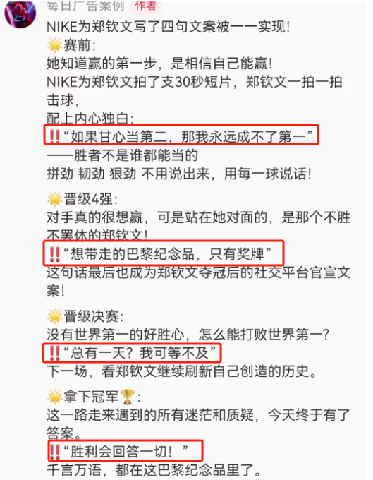 还有网友总结耐克为郑钦文写的文案,堪比“预言式”文案,因为郑钦文把耐克的“狠话”变成现实。
