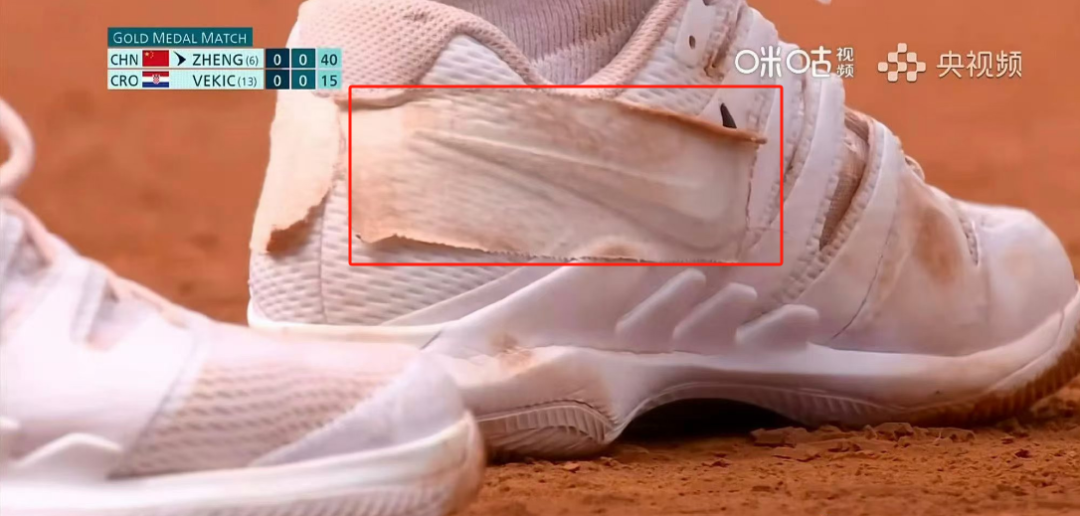 网友发现镜头给到郑钦文鞋子时,球鞋商标处被贴上白色胶布,但因为胶布凹凸痕迹明显很容易看出是耐克,这玩得一手“欲盖弥彰”。